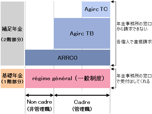 フランスの公的年金制度の中で、日本企業等の駐在員の方々が加入する民間被用者を対象とする年金制度は、一般制度と呼ばれる基礎年金と、強制加入の企業年金である補足年金(ARRCO、Agirc等)との2階建ての構造になっています。